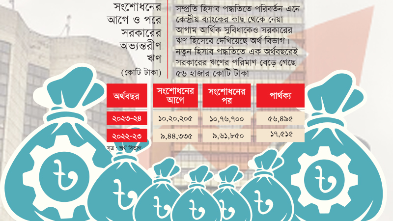 অর্থের প্রয়োজন মেটাতে কেন্দ্রীয় ব্যাংক থেকে আগাম আর্থিক সুবিধা নেয় সরকার। এটি সরকারের দায় হলেও এতদিন অভ্যন্তরীণ উৎস থেকে নেয়া ঋণের হিসাবে তা দেখানো হতো না। ফলে সরকারের গ্রহণ করা ঋণের প্রকৃত চিত্র উঠে আসেনি। তবে সম্প্রতি হিসাব পদ্ধতিতে পরিবর্তন এনে কেন্দ্রীয় ব্যাংকের কাছ থেকে নেয়া আগাম আর্থিক সুবিধাকেও সরকারের ঋণ হিসেবে দেখিয়েছে অর্থ বিভাগ। নতুন হিসাব পদ্ধতিতে এক অর্থবছরেই সরকারের ঋণের পরিমাণ বেড়ে গেছে ৫৬ হাজার কোটি টাকা।