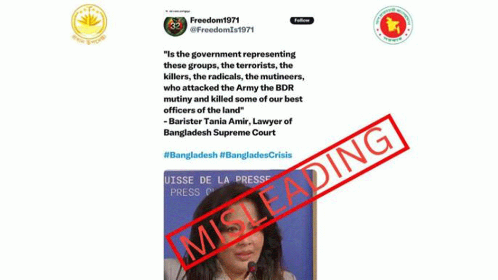 ২০০৯ সালের বাংলাদেশ রাইফেলস (বিডিআর) বিদ্রোহ নিয়ে ব্যারিস্টার তানিয়া আমিরের বক্তব্য বিভ্রান্তিকর। তার এমন মন্তব্য ক্ষমতাচ্যুত আওয়ামী লীগ সরকারের সমর্থক হিসেবে তার নিজস্ব রাজনৈতিক এজেন্ডারই প্রতিফলন বলে মন্তব্য করেছে প্রধান উপদেষ্টার প্রেস উইং।