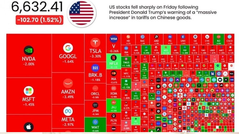 ওয়াল স্ট্রিটে ঐতিহাসিক পতন দেখা দিয়েছে, যেখানে প্রধান মার্কিন শেয়ার সূচকগুলো ট্রাম্পের প্রেসিডেন্ট হওয়ার পর থেকে সবচেয়ে বড় ধসের মুখে পড়েছে। এই বাজারের ধস ঘটে ট্রাম্পের ঘোষণা পরেই, যেখানে তিনি অ্যাপেক সম্মেলনের সময় চীনের প্রেসিডেন্ট শি জিনপিংয়ের সঙ্গে নির্ধারিত বৈঠক বাতিল করেন। পাশাপাশি তিনি আমদানি করা চীনা পণ্যের ওপর বড় ধরনের শুল্ক আরোপের ইঙ্গিত দেন, যা বিশ্বের দুই বৃহত্তম অর্থনীতির মধ্যে পুনরায় বাণিজ্যযুদ্ধের আশঙ্কা জাগায়। মার্কিন গণমাধ্যমের প্রতিবেদনে বলা হয়েছে, শুক্রবারের শেষ পর্যায়ে সপ্তাহব্যাপী সব লাভ মুছে যায়। বিশ্লেষকেরা বলছেন, এই পতনের মূল কারণ হলো বৈশ্বিক বাণিজ্য সম্পর্কের অনিশ্চয়তা এবং অর্থনৈতিক প্রভাব নিয়ে উদ্বেগ। ঘোষণার পর বৈশ্বিক বাজারে বড় ধরনের অস্থিরতা এবং বিনিয়োগকারীদের মধ্যে আতঙ্ক তৈরি হয়।