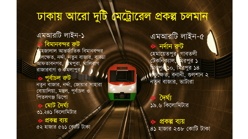 বিমানবন্দর-কমলাপুর ও নতুনবাজার-পূর্বাচলের মধ্যে নির্মিতব্য মেট্রোরেল (এমআরটি লাইন ১) প্রকল্পটির অনুমোদিত নির্মাণ ব্যয় ৫২ হাজার ৫৬১ কোটি টাকা। বিমানবন্দর-কমলাপুর ও নতুনবাজার-পূর্বাচলের মধ্যে নির্মিতব্য মেট্রোরেল (এমআরটি লাইন ১) প্রকল্পটির অনুমোদিত