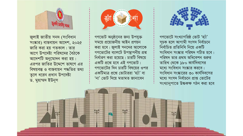 ত্রয়োদশ জাতীয় সংসদ নির্বাচনের দিন একই সঙ্গে গণভোট অনুষ্ঠানের সময় নির্ধারণ করে ‘জুলাই জাতীয় সনদ (সংবিধান সংস্কার) বাস্তবায়ন আদেশ, ২০২৫’ জারি করেছে সরকার। চারটি বিষয়ে একটি প্রশ্নে হবে গণভোট। ত্রয়োদশ জাতীয় সংসদ নির্বাচনের দিন একই সঙ্গে গণভোট অনুষ্ঠান