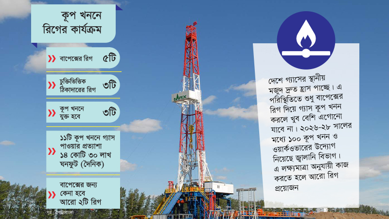 দেশে গ্যাসের মজুদ সক্ষমতা বাড়াতে কূপ খনন কার্যক্রমে যুক্ত রয়েছে স্থানীয় তেল-গ্যাস অনুসন্ধান কোম্পানি বাপেক্সের পাঁচটি রিগ। এর বাইরে চুক্তিভিত্তিক তিনটি রিগ টার্ন কি পদ্ধতিতে কূপ খননে নিয়োজিত রয়েছে। এ কাজের তৎপরতা বাড়াতে আরো তিনটি রিগ চুক্তিতে দেশে আন